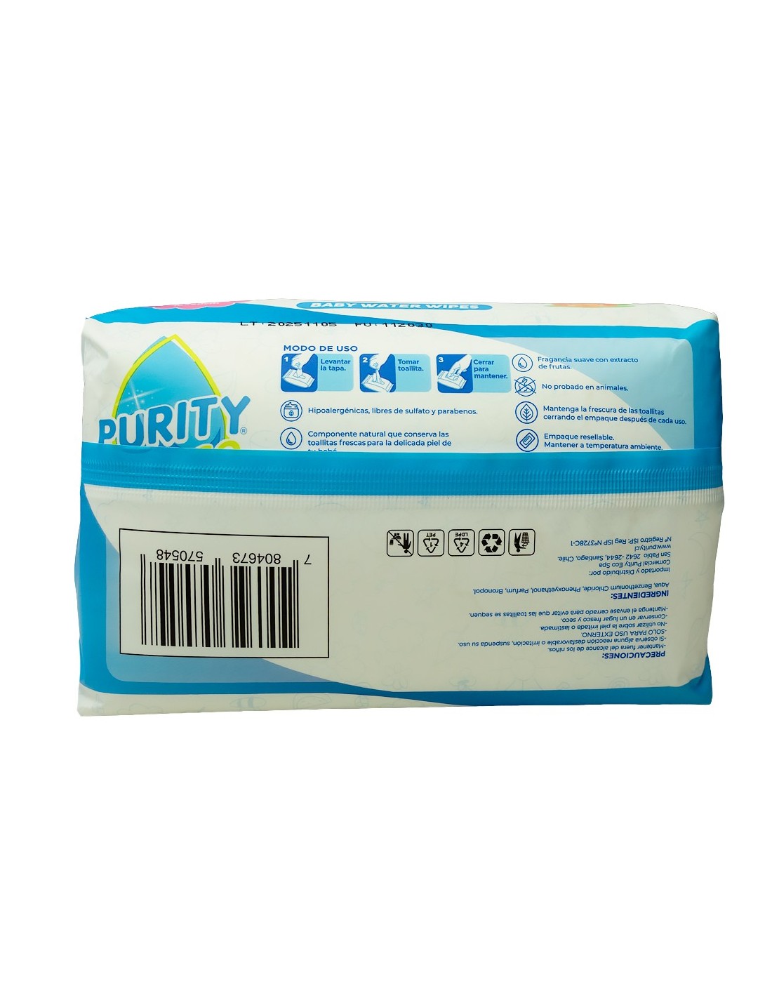Las Baby Water Wipes Purity Eco están especialmente diseñadas para la higiene y cuidado diario de la piel delicada del bebé. Su fórmula suave, compuesta con 99,9% agua y componentes naturales, limpia eficazmente mientras protege la piel sensible.